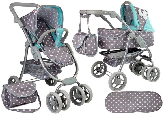 Wózek z torbą jest w szary w białe kropki z turkusowymi elementami, daje to dużo uroku. Wzornictwo przypomina prawdziwy odpowiednik, co dodaje realizmu. Konstrukcja wykonana jest z solidnych i wytrzymałych rurek aluminiowych o srebrnym kolorze, które połączone są szarymi plastikowymi łącznikami. Użycie do produkcji wózka wysokogatunkowego tworzywa odpowiada za komfort i wygodę płynące z użytkowania zabawki, co w połączeniu z ulokowaniem wózka na czterech wąskich kołach podnosi łatwość prowadzenia wózka i manewrowania nim.