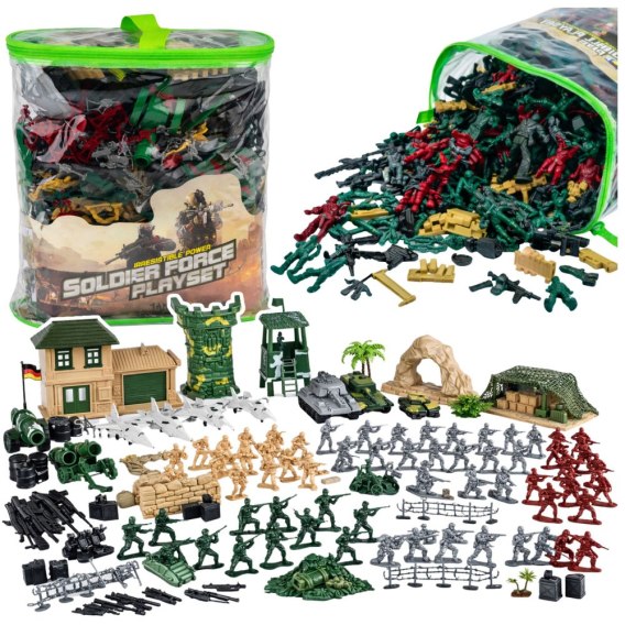 Zestaw zapakowany jest w praktyczną, przezroczystą torbę zamykaną na zamek, która ułatwia przechowywanie oraz transport wszystkich elementów. Dzięki temu zabawkę można zabrać ze sobą w podróż, do szkoły czy na spotkanie z kolegami. Różnorodność elementów takich jak żołnierzyki, pojazdy, broń czy armaty sprawia, że zabawa nigdy się nie nudzi.