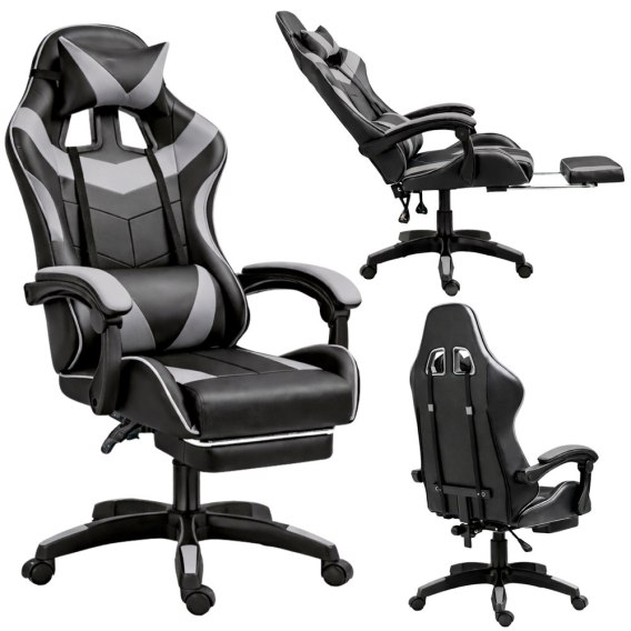FOTEL GAMINGOWY LEAN CZARNO SZARY KRZESŁO BIUROWE OBROTOWE Z PODNÓŻKIEM