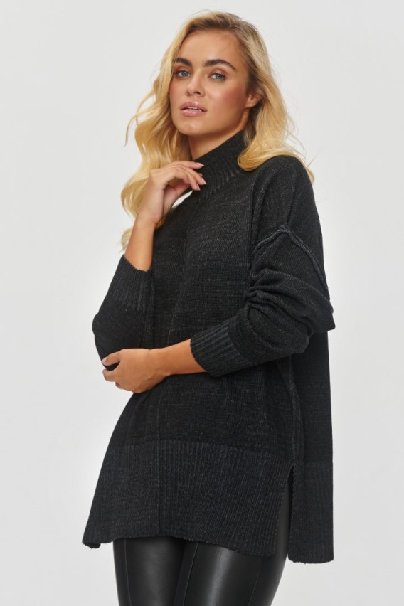 Oversizeowy sweter damski w kolorach melanżowych. Sweter ma luźny krój z obniżoną linią ramion, co nadaje mu casualowego, wygodnego charakteru. Wysoki, zabudowany dekolt typu półgolf oraz szerokie ściągacze na rękawach i na dole swetra dodają mu ciepła i komfortu, idealnego na chłodniejsze dni. Sweter ma dłuższy fason, sięgający za biodra, z bocznymi rozcięciami, co dodaje mu nowoczesności i ułatwia noszenie z różnymi elementami garderoby, jak na przykład legginsy czy wąskie spodnie. Melanżowy wzór materiału dodaje tekstury i przyciąga uwagę, sprawiając, że sweter jest stylowy a jednocześnie uniwersalny. Całość dopełnia przechodzący przez środek efektowny szew. Jest to doskonały wybór na codzienne stylizacje, szczególnie w połączeniu z bardziej dopasowanymi dolnymi częściami stroju, co pozwala zachować równowagę sylwetki.