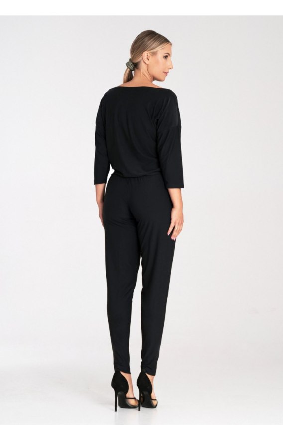 Kombinezon o luźnym fasonie z długimi, zwężanymi nogawkami oraz rękawem 3/4. Ściągany i wiązany w pasie. Dekolt w łódkę.