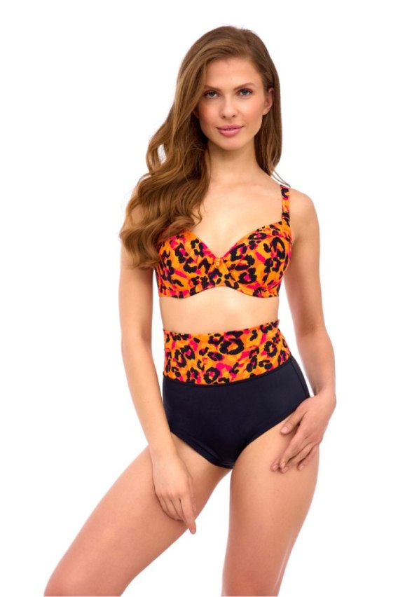Damskie figi kąpielowe w czarnym kolorze z wyższym ozdobnym pasem to doskonałe połączenie stylu i komfortu. Pas w pomarańczowy kolorze, w panterkę nie tylko zdobi, ale także maskuje ewentualne mankamenty figury, optycznie modelując sylwetkę. Figi mają wyższy stan, co zapewnia komfort noszenia i dodatkowe podparcie dla brzucha, a pełny tył gwarantuje elegancję i dyskrecję.