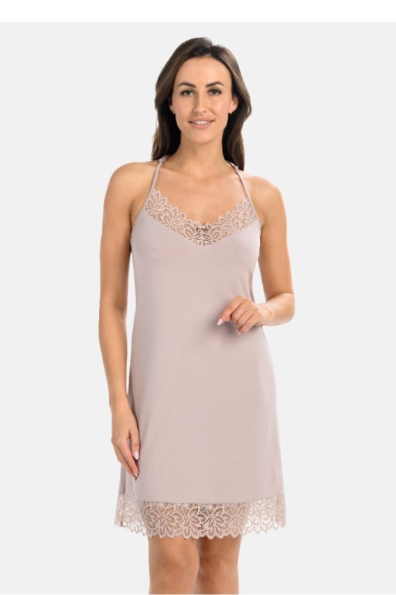 Przedstawiamy damską koszule nocną w kolorze cocoa. Wyjątkowa kombinacja przyjemnej w dotyku wiskozy z dodatkiem elastanu gwarantuje nie tylko wyjątkową miękkość, ale także doskonałe dopasowanie do Twojej sylwetki, sprawiając, że każda chwila spędzona w tym pięknie wykonanym stroju będzie niezapomniana. Nasz produkt wyróżnia się nie tylko doskonałym komfortem, ale również niesamowitą finezją w detalu. Rozkoszuj się pięknem delikatnej koronki, która zdobi plecy, dekolt oraz dolną część koszuli, dodając subtelnej nuty romantyzmu i wyjątkowego uroku. Ten wyrafinowany wzór koronki jest misternie wkomponowany w całość, podkreślając wyjątkowy charakter tego produktu. Koszula nocna została zaprojektowana w kształcie litery A, dzięki czemu doskonale podkreśla Twoją sylwetkę i zapewnia swobodę ruchów. Jej długość sięgająca przed kolano dodaje klasy i subtelności, idealnie równoważąc elegancję z wygodą. Cienkie, regulowane ramiączka pozwalają dostosować koszulę do preferencji, zapewniając idealne dopasowanie do figury. To produkt stworzony dla tych, którzy cenią sobie nie tylko wyjątkowy wygląd, ale także niepowtarzalny komfort podczas nocnego wypoczynku. Nasza koszula nocna w kolorze cacao to nie tylko ubranie, to również doznania, które można nosić na skórze. Spraw, by Twój czas spędzony w domowym zaciszu był pełen luksusu i piękna dzięki tej niezwykle urokliwej i wyjątkowo dopracowanej koszuli nocnej.