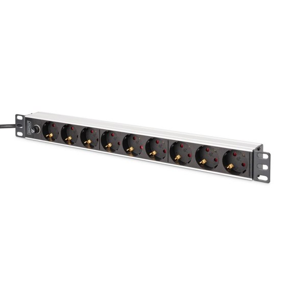 Listwa zasilająca DIGITUS PDU Rack 19" z bezpiecznikiem przeciążeniowym, 9 gniazd Schuko CEE 7/3 (45°), kabel 2m wtyk IEC C14, 1 Digitus
