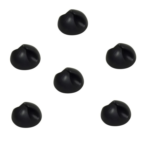6 uchwytów samoprzylepnych, Nadają się do kabli o maksymalnej średnicy 8mm, Pasują do kabli, przewodów i słuchawek, Wymiary podstawy 30x30x18mm