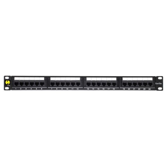 Informacje dodatko...: Porty rozmieszczone w 4 grupach po 6, Złącza do podłączenia wtyków z przodu RJ45 UTP, Złącza do podłączenia przewodów z tyłu typu Krone, Z tyłu złącza są opisane nr portu oraz sposobem podłączenia przewodów, Do podłączenia przewodów należy użyć noża typu KRONE, Półka do ułożenia kabli z tyłu patch panela, Zaczepy do mocowania wiązki przewodów, Opisy portów - plastikowe okienka do włożenia papierowych opisów