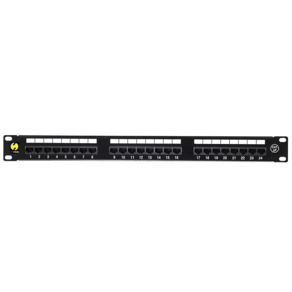 Grzebień do zamocowania każdego przewodu, Liczba portów - 24, Panel przedni wyposażony w pole identyfikacyjne portów - białe, Porty rozmieszczone w 3 grupach po 8, Złącza do podłączenia przewodów z tyłu typu Krone, Złącza do podłączenia wtyków z przodu RJ45
