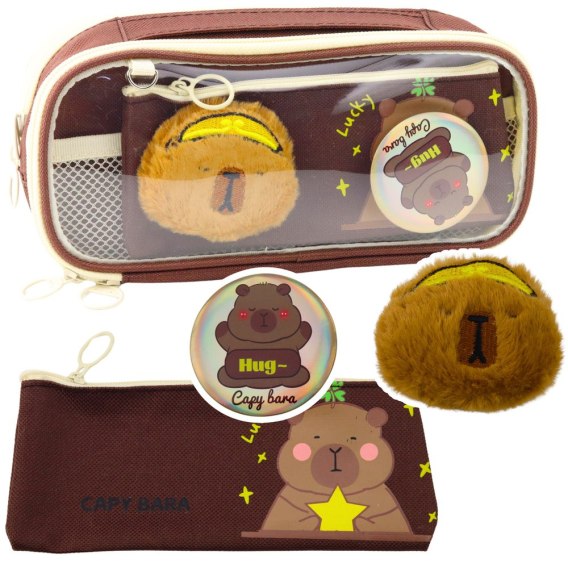 Całość uzupełnia pluszowy brelok w kształcie kapibary oraz ozdobna przypinka z tym samym motywem, które pozwalają spersonalizować wygląd piórnika i dodać mu uroku.