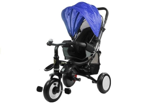 Prezentowany rower trójkołowy swą konstrukcją przypomina wózek typu spacerówka — świadczy o tym rozkładany daszek z siatką czy w pełni regulowane oparcie pozwalające na ustawienie pozycji półleżącej, dzięki czemu potowarzyszy on Twojemu maluszkowi od pierwszych lat życia aż do czasu, gdy będzie mógł samodzielnie jeździć na dwukołowym rowerku. Pojazd dla maluchów w ciemnoniebieskim odcieniu oparty jest na trzech piankowych kołach, które posiadają wiele zalet — są odporne na przebicia, a ich waga jest dużo niższa, niż w przypadku opon pompowanych.