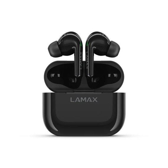 Bezprzewodowe słuchawki TWS, douszne, wytrzymałość 8h/1 ładowanie,całkowita, Całkowity czas słuchania: 40 godz., Czas ładowania etui od 0% do 100%: 2 godziny, Czas ładowania słuchawek od 0% do 100%: 1 godzina, etui ładujące, wskaźnik ładowania, kodeki AAC i SBC, obsługa asystentów, głosowych, zapasowe słuchawki, lub odrzucić połączenie., Łączność: USB-C, na słuchawce. Obu słuchawek można używać osobno. Można odebrać, zakończyć, Obsługiwane kodeki: AAC, SBC, Pojemność baterii słuchawek: 45 mAh, Pojemność baterii stacji ładującej: 500 mAh, Technologia bezprzewodowa: Bluetooth 5.1, Typ słuchawek: Douszne, true wireless, USB-C, technologia LAMAX BeatBass®, automatyczne parowanie, tryb gry, małe, Waga: 4 g (jedna słuchawka), 43 g (razem ze stacją ładującą), Wymiary stacji ładującej: 46 x 56 x 23 mm, wytrzymałość 40h, Bluetooth 5.1, zasięg do 10 metrów, sterowanie dotykowe,, Zintegrowany mikrofon. Sterowanie handsfree za pomocą powierzchni dotykowej