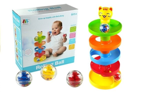 Na czym polega zabawa? Należy włożyć piłeczki do otworu znajdującego się w pierwszej platformie, a następnie pozwolić im swobodnie pokonywać pięterka i opadać w dół. Piłeczki wypadają otworkami znajdującymi się w każdym z poziomów, oznaczonymi numerkami 1, 2, 3, 4 i 5. Zabawka z pewnością zainteresuje każdego maluszka, dzięki czemu z dużą radością będzie chciał oglądać toczące się piłeczki. Jednak to nie wszystko — warto podkreślić, że jest to zabawka edukacyjna. Okrągłe piłeczki posiadają w środku grzechoczące elementy, co będzie stymulować słuch dziecka — wyostrzy go, a także rozwinie zdolność rozróżniania dźwięków. Kolorowe kuleczki posłużą również do ćwiczeń umiejętności łapania, a także rozwoju koordynacji i siły mięśni. Przyjemne dla oka, łagodne barwy zabawki, wpłyną na zmysł wzroku, natomiast delikatnie zaokrąglone kształty wywrą pozytywny wpływ na zmysł dotyku maluszka.