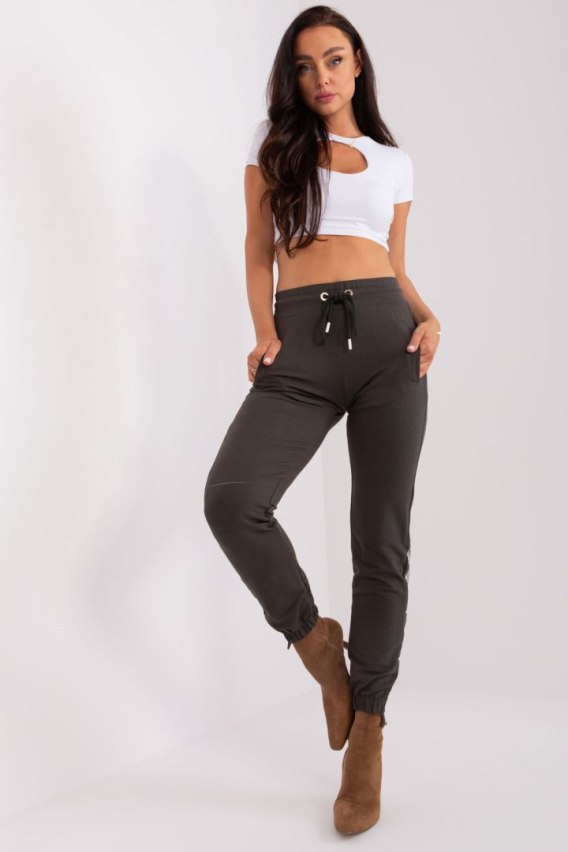 Damskie spodnie dresowe w stylu casual to idealna propozycja na codzienne, komfortowe stylizacje. Wykonane z miękkiej bawełny z dodatkiem elastanu, zapewniają wygodę i elastyczność podczas noszenia. Model z wysokim stanem, który pięknie podkreśla talię i zapewnia lepsze dopasowanie. Spodnie posiadają ściągacze przy nogawkach oraz wiązanie w pasie, co dodaje im sportowego charakteru i pozwala na regulację obwodu. Praktyczne boczne kieszenie zwiększają funkcjonalność. Gładka tkanina ozdobiona jest nadrukiem na nogawkach oraz delikatnymi dżetami, które dodają całości modnego, niebanalnego wyglądu. Świetne na spacer, zakupy czy domowy relaks, must-have w każdej casualowej garderobie.