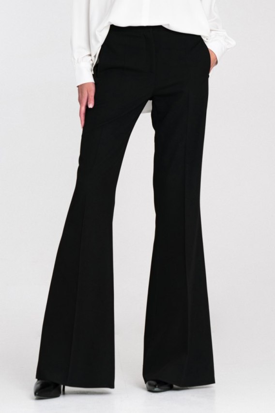 Stylowe spodnie damskie o dopasowanym kroju (fit) i średnim stanie, które podkreślają sylwetkę, zachowując elegancki charakter. Model z nogawką mocno rozszerzającą się od kolana ku dołowi, co optycznie wydłuża nogi i nadaje całości modny, kobiecy wygląd. Z przodu i z tyłu znajdują się zaprasowane kanty, dodające spodniom szyku i profesjonalnego wyrazu. Spodnie posiadają zapięcie na suwak i guzik oraz klasyczne kieszenie z przodu. Uniwersalny model, który doskonale sprawdzi się zarówno w stylizacjach biurowych, jak i eleganckich zestawach na co dzień.