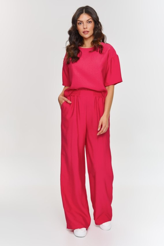 Ten elegancki komplet to idealna propozycja na wiosenne i letnie dni, kiedy chcesz połączyć modny wygląd z wysoką jakością wykonania. Zestaw posiada luźną bluzkę o pudełkowym kroju, który idealnie pasuje do eleganckich stylizacji. Krótki rękaw i prosty fason bluzki sprawiają, że jest to doskonała opcja na formalne i mniej formalne wyjścia, łącząc elegancję z wygodą. Spodnie wyróżniają się szerokimi nogawkami, które nadają stylizacji nowoczesny i elegancki wygląd. Elastyczny pas zapewnia komfort noszenia, a ich długość dodaje całości klasy i stylu. Model wykonany z delikatnego i lekkiego materiału imitującego len. Prosty, ale wysublimowany krój sprawia, że komplet ma ponadczasowy charakter, który będzie wyglądać stylowo na każdej sylwetce. Zestaw doskonale sprawdzi się na spotkania biznesowe, eleganckie wyjścia czy wypady do miasta, kiedy zależy Ci na połączeniu elegancji i swobody. Możesz go zestawić ze szpilkami, eleganckimi sandałami lub białymi sneakersami.
