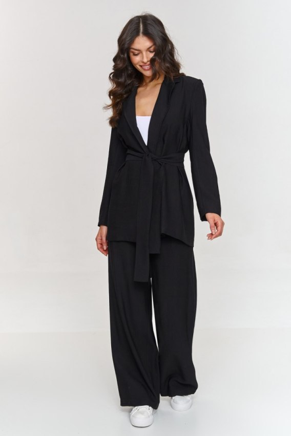 Ten damski komplet został zaprojektowany z myślą o kobietach, które szukają połączenia stylu, wygody i nowoczesnej elegancji. Marynarka o dłuższym luźnym kroju, nadaje stylizacji nowoczesny charakter a wiązany pasek pozwala na dopasowanie do sylwetki podkreślając linię talii. Nie posiada podszewki co czyni ją lżejszą i swobodniejszą. Spodnie o szerokich nogawkach podkreślają modny wygląd a elastyczny pas zapewnia maksymalny komfort. Model wykonany z lekkiego, strukturalnego materiału, który akcentuje jego wyjątkowość i klasę. Dodatkowym plusem jest możliwość noszenia każdego elementu oddzielnie tworząc różnorodne i oryginalne outfity. Dzięki prostej ale efektownej konstrukcji komplet jest doskonałym rozwiązaniem zarówno na wypady ze znajomymi jak i do biura, na spotkania biznesowe i inne formalne wyjścia gdzie chcesz wyglądać profesjonalnie jednocześnie nie rezygnując z wygody.
