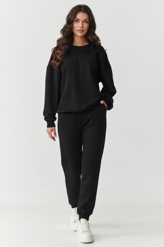 Stylowy komplet dresowy dla kobiet, który łączy nowoczesny design z wyjątkowym komfortem noszenia. Wykonany z wysokiej jakości dzianiny o składzie 95% bawełna i 5% elastan, zapewnia miękkość, elastyczność oraz idealne dopasowanie do sylwetki. To doskonały wybór na co dzień, sprawdzi się w domu, podczas spacerów, zakupów czy weekendowego relaksu. Głównym wyróżnikiem tego zestawu jest haftowana aplikacja z logo marki na przodzie bluzy, która dodaje mu oryginalnego charakteru i modowego wyrazu. Bluza ma luźniejszy krój z obniżoną linią ramion i zakończona jest wygodnymi ściągaczami przy rękawach i na dole, co nadaje jej casualowego stylu. Okrągły dekolt również wykończony subtelnym ściągaczem co podkreśla jego ponadczasowość. Spodnie wyposażone są w elastyczną talię oraz ściągacze przy nogawkach, dzięki czemu świetnie układają się na sylwetce i zapewniają wygodę przez cały dzień. Ten dres to idealne połączenie funkcjonalności i stylu. Sprawdzi się zarówno jako zestaw, jak i noszony osobno. Uniwersalny fason pasuje do wielu okazji i gwarantuje swobodę ruchów bez kompromisów. Postaw na jakość, wygodę i modny detal wybierz dres z haftowaną aplikacją, który podkreśli Twój styl każdego dnia!