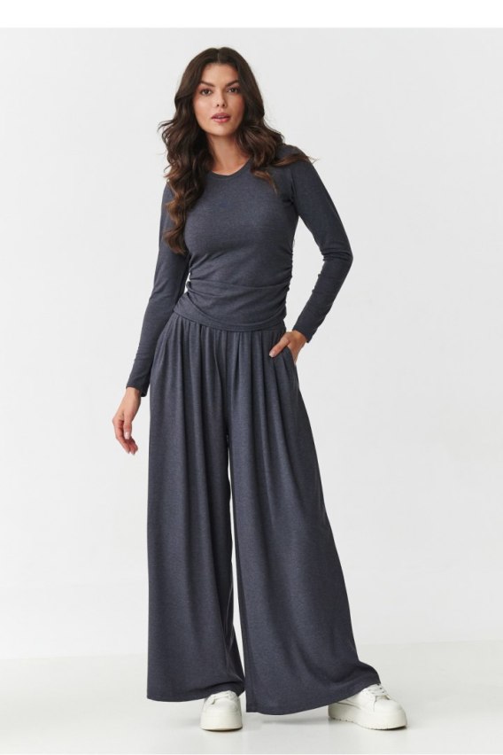 Ten komplet to idealna propozycja dla kobiet, które szukają połączenia wygody, stylu i delikatności. Wykonany z miękkiej, przyjemnej w dotyku wiskozy, idealnie dopasowuje się do sylwetki, zapewniając swobodę ruchów i wygodę przez cały dzień. Górę zestawu stanowi dopasowana bluzka z długim rękawem, która wyróżnia się subtelnym marszczeniem po bokach. Ten kobiecy detal nie tylko podkreśla talię, ale też nadaje całości eleganckiego, ale niezobowiązującego charakteru. To połączenie prostoty z modnym detalem sprawia, że bluzka świetnie sprawdzi się nie tylko jako część kompletu, ale również solo w wielu stylizacjach. Szerokie, luźno układające się spodnie to gwarancja wygody i stylu w jednym. Dzięki elastycznej talii i swobodnemu krojowi świetnie sprawdzają się w ruchu, a boczne kieszenie dodają im funkcjonalności. To idealny fason zarówno do noszenia w domu, jak i w streetowych stylizacjach. Zestaw damski dostępny jest w modnych, uniwersalnych kolorach: antracytowy, czarny, czekoladowy, khaki oraz bordowy. Postaw na komfort, który idzie w parze z kobiecym wyglądem wybierz komplet z wiskozy, który dopasuje się do Twojego stylu życia i sylwetki.