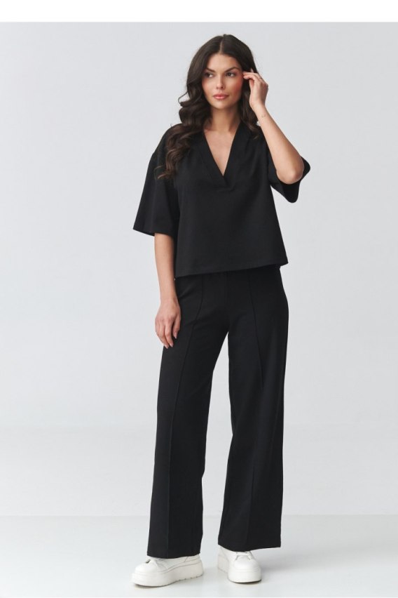 Stylowy komplet damski z szerokimi spodniami to idealne połączenie wygody i nowoczesnej elegancji. Zestaw składa się z luźnej bluzki z dekoltem w kształcie litery V oraz spodni o szerokich nogawkach, które pięknie wydłużają sylwetkę i nadają stylizacji lekkości. Ten elegancki komplet damski sprawdzi się zarówno na co dzień, jak i na bardziej formalne okazje. To doskonały wybór do pracy, na spotkanie, spacer czy wyjazd. Minimalistyczny fason pozwala tworzyć różnorodne stylizacje, w wersji sportowej ze sneakersami lub bardziej szykownej z eleganckim obuwiem. Bluzka o swobodnym kroju zapewnia komfort noszenia i subtelnie podkreśla linię dekoltu, natomiast spodnie z szeroką nogawką damskie gwarantują wygodę oraz modny, ponadczasowy wygląd. Całość tworzy spójny komplet casualowy damski, który łączy luz z klasą.