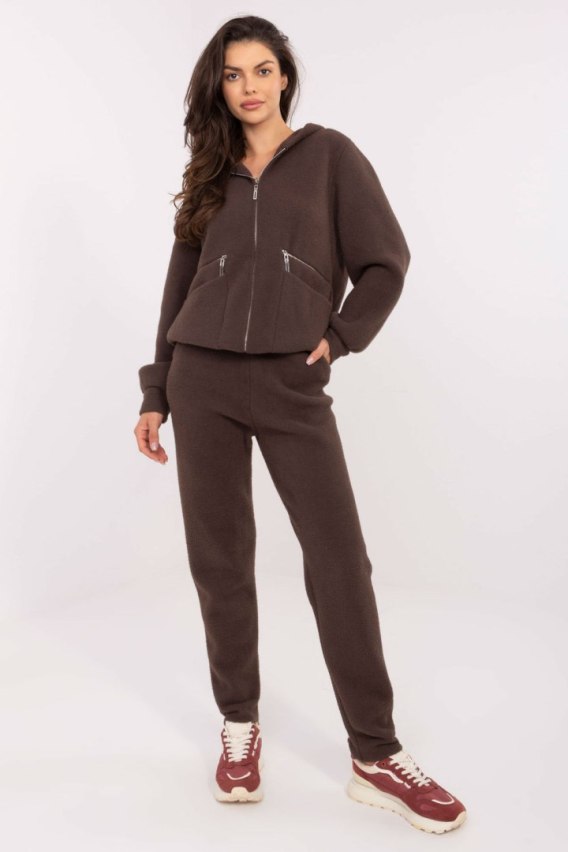 Ten casualowy komplet damski to idealna propozycja na chłodniejsze dni stylowy, wygodny i przyjemnie otulający. Wykonany z wysokiej jakości mieszanki wełny, wiskozy, angory i poliestru, zapewnia doskonały komfort cieplny, miękkość oraz trwałość. Bluza zapinana na zamek posiada praktyczny kaptur, długi rękaw oraz duże naszyte kieszenie na przodzie, które dodają charakteru i funkcjonalności. Jej prosty, gładki wzór sprawia, że doskonale komponuje się z różnymi dodatkami i sprawdzi się zarówno w domu, jak i na spacerze. Spodnie o długich, zwężanych nogawkach mają wysoki stan i wiązanie w pasie, dzięki czemu świetnie dopasowują się do sylwetki. Boczne, wsuwane kieszenie dodają praktyczności bez zaburzania minimalistycznej formy. To komplet idealny na codzienne aktywności, łączy swobodę ruchów, ciepło i modny wygląd w jednym zestawie.