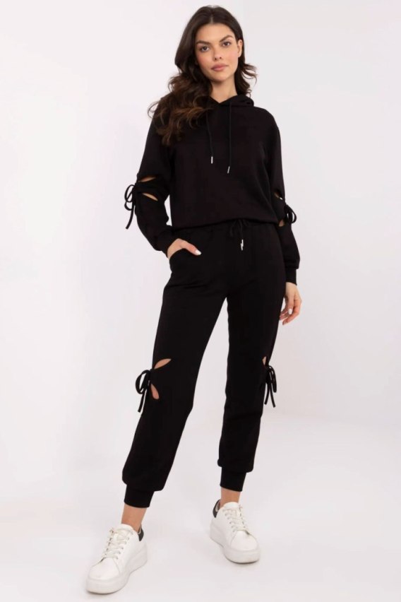 Casualowy komplet dresowy to idealne połączenie wygody i modnego stylu. Wykonany z miękkiej mieszanki wiskozy, poliestru i elastanu, zapewnia komfort noszenia i swobodę ruchów. Bluza z kapturem ma długi rękaw oraz subtelne rozcięcia na rękawach z ozdobnymi wiązaniami, które nadają całości oryginalnego charakteru. Spodnie z wysokim stanem i wsuwanymi bocznymi kieszeniami gwarantują wygodę, a ściągacze przy nogawkach podkreślają sportowy styl. Dodatkowym atutem są rozcięcia na nogawkach z ozdobnymi wiązaniami, które nadają niebanalnego wyglądu. Elastyczny pas z wiązaniem pozwala na idealne dopasowanie. To doskonały wybór na co dzień dla kobiet ceniących komfort i modowy akcent w stylizacjach. Komplet wykonany z materiał typu masełko, wyjątkowo miękki, przyjemny w dotyku, doskonale dopasowujący się do ciała.
