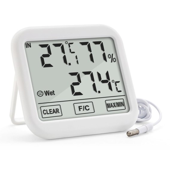 Informacje dodatko...: Zakres wilgotności:10% ~ 99%, Zakres temperatury wewnętrznej: -10°C~50°C, Zakres temperatury zewnętrznej: -50°C~70°C, Dokładność: 0,1°C (temperatura) 1% RH (wilgotność), Częstotliwość odświeżania: 10 sekund, Materiał wykonania: tworzywo ABS, Zasilanie: 2x bateria: 1.5 V AAA (w zestawie), Wymiary produktu: 105 x 94 x 25 mm, Długość przewodu sondy: 150 cm, Wskaźnik poziomu komfortu