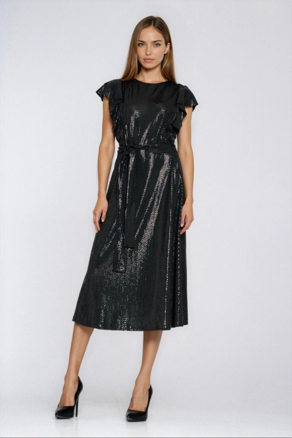 Efektowna sukienka o eleganckim fasonie, łącząca dopasowaną górę z trapezowym dołem, który pięknie układa się w ruchu. Wykonana z materiału zdobionego klejonymi cekinami, zachwyca blaskiem i przyciąga spojrzenia. Model z okrągłym dekoltem pod szyję prezentuje się nowocześnie i stylowo. Bezrękawnikowy krój uzupełniają ozdobne falbany na ramionach, dodające lekkości i kobiecego charakteru. Długość za kolano sprawia, że sukienka jest elegancka i uniwersalna. Zapinana z tyłu na kryty zamek, gwarantuje estetyczne wykończenie oraz wygodę noszenia. W komplecie znajduje się pasek, który podkreśla talię i dopełnia całość stylizacji. Idealna propozycja na uroczystości, przyjęcia i wyjątkowe okazje.