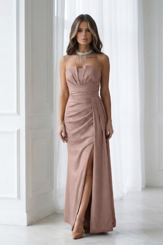 Olśniewająca sukienka wieczorowa w odcieniu camelu, wykonana z subtelnie połyskującej tkaniny zapinana na kryty zamek. Nowoczesny gorset z efektownymi zakładkami przy dekolcie pięknie eksponuje ramiona, a fantazyjne drapowania w talii perfekcyjnie podkreślają sylwetkę. Głębokie rozcięcie na nogę dodaje kreacji zmysłowości i lekkości w ruchu. Odpinane ramiączka zapewniają swobodę stylizacji. To idealna propozycja na studniówkę, wesele lub inne wyjątkowe wydarzenia.
