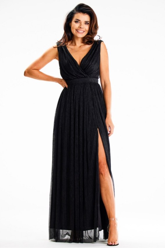 Wyjątkowa sukienka maxi z delikatnie rozkloszowanym dołem i rozcięciem z przodu. Góra sukienki w stylu kopertowym prezentuje duży dekolt na plecach, co nadaje całości wyjątkowego uroku. Wykonana z błyszczącej siatki, wsparta na satynowej podszewce. Idealna na wieczorne wyjścia.