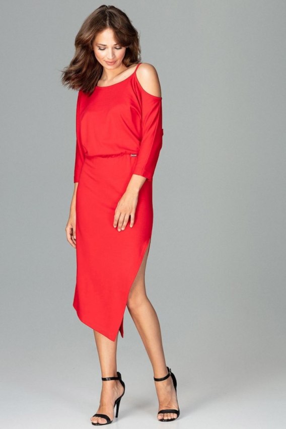 Świetna sukienka asymetryczna z kimonowym rękawem opadającym na jedno ramię. Z lewej strony rozcięcie na udzie pięknie podkreśli kobiecość a asymetryczne wykończenie za kolano nada komfortu. Najmodniejszy look tego sezonu.