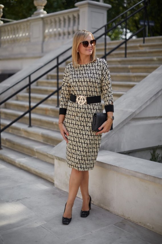 Bardzo kobieca i wygodna sukienka z dzianiny żakardowej z dodatkiem elastanu. Zaprojektowana zgodnie z zasadami marki czyli z myślą o kobietach dojrzałych. Kimonowa góra z opadającym rękawem, gumo-pasek z dużą ozdobną klamrą do regulacji obwodu talii, stonowana kolorystyka oraz miękka i układalna dzianina w gramaturze ok 280 gm2. To wszystko sprawia, że sukienka idealnie sprawdzi się w większych rozmiarach.