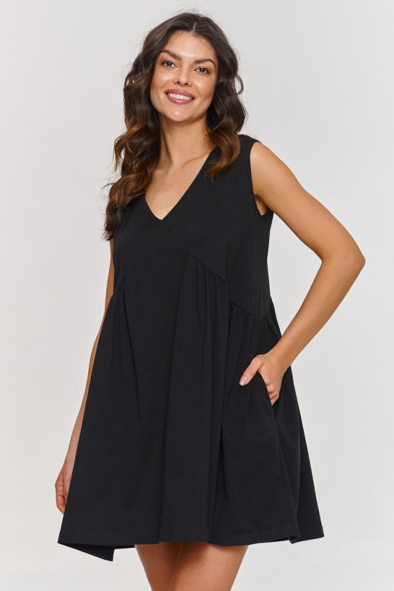 Ta dresowa sukienka trapezowa to doskonały wybór dla kobiet ceniących wygodę i styl. Została zaprojektowana w luźnym fasonie, który zapewnia pełną swobodę ruchów. Trapezowy krój pozwala zatuszować szerokie biodra czy pełniejsze uda, nadając sylwetce bardziej zrównoważony wygląd. Sukienka ma dekolt w serek, co podkreśla jej subtelność i kobiecość. Długość mini to świetny sposób na eksponowanie nóg jednocześnie podkreślając lekkość i zmysłowość. Model wykonany z bawełnianego i przyjemnego w dotyku materiału, który jest przewiewny i oddychający co sprawia, że jest to doskonały wybór na cieplejsze dni. Dresowa sukienka wyróżnia się wielofunkcyjnością i ponadczasowym stylem. Idealna podczas spacerów z lekkimi sandałkami na płaskiej podeszwie, na spotkania z przyjaciółmi z wygodnymi balerinami, czy na wieczorne wyjścia w połączeniu z eleganckimi szpilkami i delikatną biżuterią.