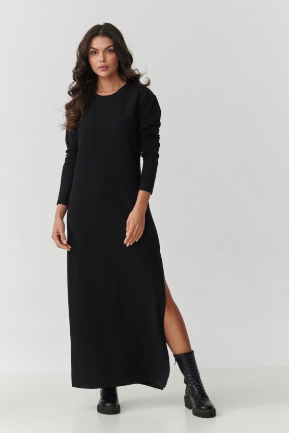Ta sukienka maxi to idealne połączenie wygody i minimalistycznej elegancji. Wykonana z miękkiego, elastycznego materiału, doskonale dopasowuje się do sylwetki, zapewniając komfort noszenia przez cały dzień. Prosty, pudełkowy krój został urozmaicony długim rękawem oraz rozcięciem po boku, które nadaje całości lekkości i subtelnie podkreśla nogi. Na uwagę zasługuje także delikatny ściągacz przy szyi, który elegancko wykańcza zaokrąglony dekolt i nadaje sukience bardziej dopracowanego charakteru. To subtelny detal, dzięki któremu model zyskuje sportowo-casualowy akcent, zachowując jednocześnie swoją kobiecą i minimalistyczną formę. Możesz nosić ją z wygodnymi trampkami czy botkami, tworząc miejski look, a w zestawieniu ze szpilkami i wyrazistą biżuterią zyskuje wieczorowy charakter. To uniwersalny model, który sprawdzi się w wielu sytuacjach, od spotkań z przyjaciółmi, przez codzienne wyjścia do pracy, aż po mniej formalne przyjęcia. Jej prostota sprawia, że można ją łatwo łączyć z różnymi dodatkami, tworząc stylizacje na każdą okazję. Sukienka maxi z długim rękawem i rozcięciem to must-have w garderobie każdej kobiety ceniącej wygodę, praktyczność i nowoczesny design.