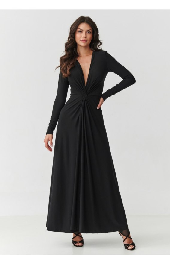 Olśniewaj elegancją i kobiecością w wyjątkowej sukience maxi z głębokim dekoltem w serek i subtelnym marszczeniem w talii. To model, który pięknie podkreśla figurę, jednocześnie zachowując klasę i lekkość. Długie rękawy oraz lejący, miękki materiał sprawiają, że sukienka doskonale dopasowuje się do sylwetki i zapewnia komfort noszenia przez cały dzień. Ta długa sukienka to idealny wybór na wyjątkowe okazje wesele, święta, kolację we dwoje czy eleganckie przyjęcie. Marszczenie w talii optycznie wysmukla sylwetkę, a rozkloszowany dół z rozcięciem pięknie układa się w ruchu, tworząc efekt WOW. Dostępna w czarnym kolorze. Zachwycaj stylem i pewnością siebie w sukience, która łączy ponadczasową elegancję z nowoczesnym urokiem.