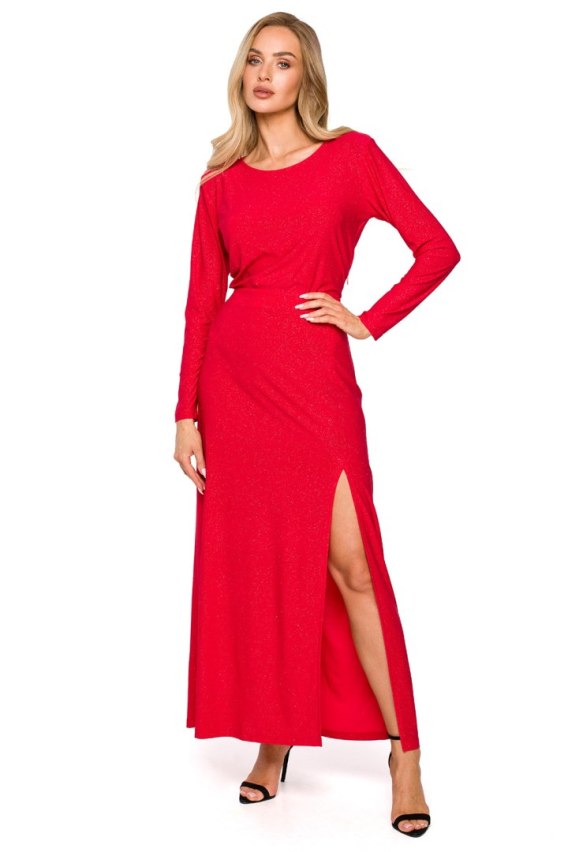 Suknia na wieczory specjalne, długa z prostym dołem i rozcięciem na nogę i z lekko zbluzowaną górą z długimi rękawami. Elegancka i wytworna. Sukienka z materiału z brokatem, bez podszewki, zapinana na kryty zamek.