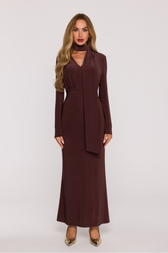 Elegancka i niezwykle kobieca sukienka maxi uszyta z gładkiej dzianiny, która zachwyca swoją miękkością, elastycznością i komfortem noszenia. Materiał pięknie dopasowuje się do sylwetki, jednocześnie nie krępując ruchów. Model wyróżnia dekolt w kształcie litery V, który subtelnie podkreśla linię szyi i dekoltu, oraz długie, dopasowane rękawy, nadające całości eleganckiego charakteru. Talia z delikatnym drapowaniem akcentuje kobiece kształty, a długi, lekko rozszerzany dół tworzy zmysłową i smukłą linię sylwetki. Dodatkowym atutem jest osobna szarfa, którą można stylizować na różne sposoby przewiązać wokół szyi, w talii lub wykorzystać jako ozdobę włosów. Sukienka nie posiada kieszeni ani podszewki, co zapewnia jej lekkość, a kryty zamek na boku gwarantuje wygodę zakładania i estetyczne wykończenie. Model zaprojektowano i uszyto w Polsce z dbałością o każdy detal. To propozycja dla kobiet, które cenią minimalistyczną elegancję, wygodę i ponadczasowy styl.