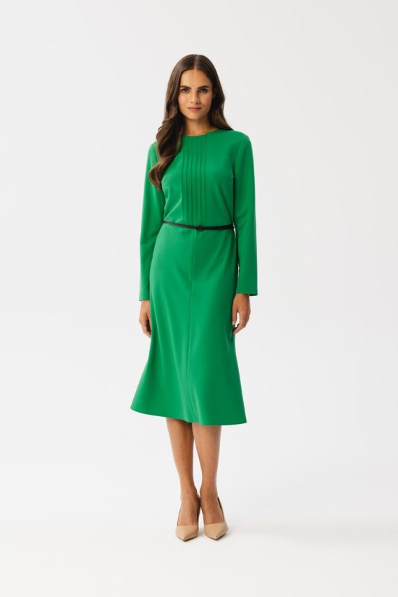 Ta sukienka wyróżnia się dekoracyjnymi przeszyciami na dekolcie, które dodają jej uroku. Odcięcie w talii podkreśla talię, a dołączony pasek ze sztucznej skóry jest stylowym dodatkiem. Długie, proste rękawy są uniwersalne i modne. Dół sukienki jest krojony ze skosu z przeszyciem przez środek, co nadaje jej lekkości. Długość za kolano sprawia, że sukienka jest odpowiednia na wiele okazji. Zamek kryty z tyłu ułatwia jej zakładanie. Sukienka jest bez podszewki, co zapewnia komfort noszenia. To sukienka, która została zaprojektowana i uszyta w Polsce, co świadczy o jej jakości i unikalności. Dodaje pewności siebie i stylu na różne okazje.