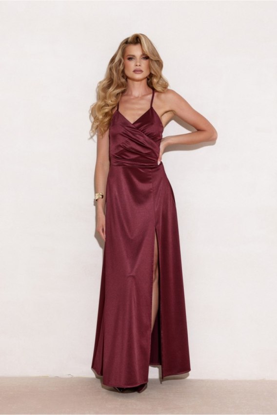 Zwiewna sukienka maxi na cienkich ramiączkach z kopertową górą i subtelnie rozkloszowanym dołem z efektownym rozcięciem na nodze. Model bez podszewki, z dekoracyjnym sznurowaniem na plecach, które pozwala na indywidualne dopasowanie do sylwetki.