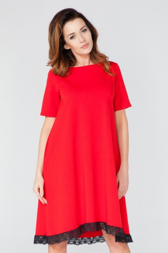 Sukienka trapezowa z dziewczęcym, koronkowym wykończeniem. Rękaw krótki. Dekolt wykończony cienkim ściągaczem. Na biodrach kieszenie w szwie.