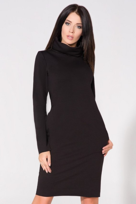 Sukienka z dzianiny z kominem. Na biodrach kieszenie w szwie. Dół oraz rękaw pozostawiony w stanie surowym.