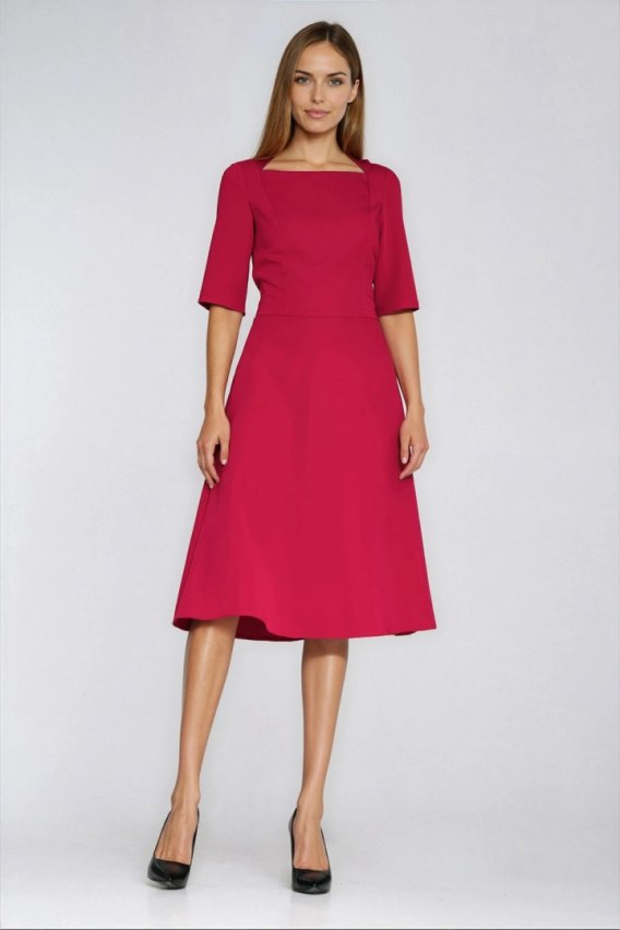 Elegancka sukienka o klasycznym i kobiecym fasonie. Posiada dopasowaną górę, która pięknie podkreśla sylwetkę, oraz trapezowy dół zapewniający swobodę ruchów i lekkość. Dekolt typu caro subtelnie eksponuje szyję i obojczyki, nadając całości szyku. Rękawy o długości przed łokieć sprawiają, że model jest uniwersalny i komfortowy w noszeniu. Sukienka sięga za kolano, co czyni ją idealnym wyborem zarówno na formalne, jak i okolicznościowe wyjścia. Odcinana w pasie, doskonale zaznacza talię, a kryty zamek z tyłu gwarantuje estetyczne wykończenie i wygodę zakładania.