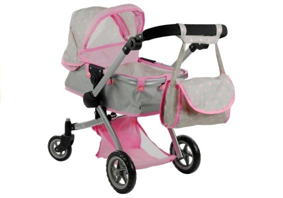 Wózek 2 w 1 przyciąga wzrok wszystkich dziewczynek swą konstrukcją, przypominającą budowę prawdziwego wózka, a także pastelową, delikatną kolorystyką, przełamaną detalami w formie wzoru groszków. To także rewelacyjny przedmiot dla kilkulatek, które lubią opiekować się zabawkowymi bobasami w różnych rozmiarach — od teraz mogą wyprowadzać swe lalki na spacer zarówno w spacerówce, jak i w klasycznym wózku z gondolą. Zmiana tych wariantów jest bardzo prosta — wymaga zaledwie kilku ruchów, a w dużym stopniu urozmaica zabawę. Kolejną, dużą zaletą innowacyjnej konstrukcji wózka dla lalek jest zamontowanie dwóch kół stałych oraz dwóch mniejszych, obrotowych o 360 stopni kółek, które sprawiają, że prowadzenie wózka i manewrowanie nim na drodze jest bardzo lekkie i niewymagające siły.