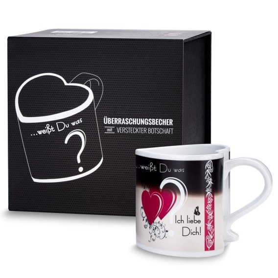 - Magiczny kubek: dzięki specjalnej farbie nadruk na kubku zmienia wygląd pod wpływem ciepła. Po wystygnięciu lub zalaniu zimną wodą wraca do stanu początkowego. W przeciwieństwie do innych termoczułych kubków, ten kubek zmienia wygląd na całej powierzchni. Nadruk wokół całego produktu. Gotowy do wręczenia na prezent bez konieczności dodatkowego pakowania. Napis na produkcie: Weißt Du was? Ich liebe Dich! Produkt w niemieckiej wersji językowej. Materiał: porcelana. Wymiary: 8,5 cm (wysokość), 300 ml (pojemność). Produkt zapakowany w pudełko prezentowe z maganetycznym zapięciem. Nie myć w zmywarce. Nie używać w mikrofalówce. Nadaje się do kontaktu z żywnością. Umyj przed pierwszym użyciem. Produkt jest chroniony zarejestrowanym znakiem towarowym. Produkt bezpieczny
