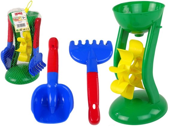 Młynek, który w zestawie zawiera łopatkę i grabki, może służyć zarówno do przesypywania piasku na plaży, jak i do przelewania wody podczas zabawy w kąpieli.