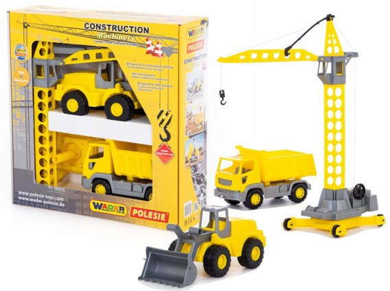 W skład zestawu wchodzą trzy pojazdy budowlane, bez których nie funkcjonowałaby żadna budowa. Wywrotka umożliwi wywiezienie zabawek z placu budowy, a unoszony kontener pozwoli na opróżnienie. Koparka posiada ruchome, szare ramię. Dźwig ma możliwość opuszczania haka, dzięki czemu można zaczepić i przenieść zabawki z miejsca na miejsce. Wózek utrzymany jest w kolorach żółto i szarym, ta kolorystyka kojarzy się z pojazdami budowy. Zapewni długie godziny zabawy na powietrzu oraz w pokoju dziecinnym. Wiele ekscytujących przygód przed nim, odgrywanie ról wpłynie na rozwój wyobraźni.